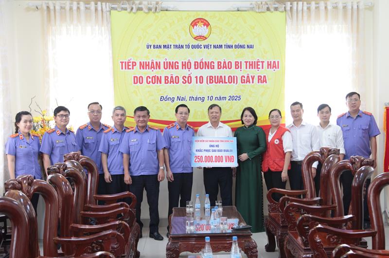 Hưởng ứng Chương trình phát động ủng hộ, hỗ trợ khắc phục hậu quả sau bão Bualoi theo công văn số 4903/VKSTC-VP ngày 04/10/2025 của Viện kiểm sát nhân dân (VKSND) tối cao, nhằm thể hiện tinh thần “tương thân tương ái”, “lá lành đùm lá rách” của ngành Kiểm sát Đồng Nai, sáng ngày 13/10/2025, VKSND hai cấp tỉnh Đồng Nai đã trao 250 triệu đồng đến Ủy ban Mặt trận Tổ quốc (UBMTTQ) Việt Nam tỉnh Đồng Nai để ủng hộ đồng bào bị thiệt hại nặng nề do cơn bão số 10 (BUALOI) gây ra. Số tiền này được trích từ một ngày lương của toàn thể cán bộ, công chức, người lao động trong đơn vị, trong đó có 1 số cá nhân ngoài một ngày lương của mình, còn ủng hộ thêm với số tiền là 05 triệu đồng và 01 triệu đồng, đó là các đồng chí: Nguyễn Quốc Hân – Viện trưởng VKSND tỉnh Đồng Nai, đồng chí Nguyễn Hoàng Anh – Trưởng phòng 7 VKSND tỉnh, đồng chí Lê Quốc Tuấn – Kiểm sát viên VKSND khu vực 10.