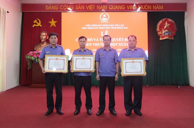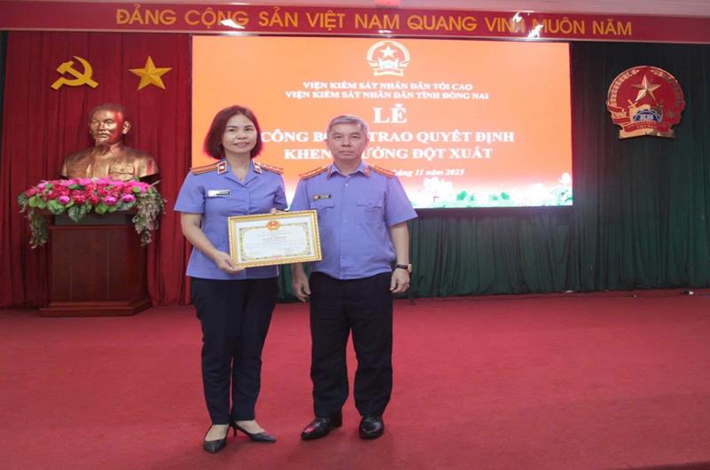 Trong thời gian qua, Viện kiểm sát nhân dân (VKSND) hai cấp tỉnh Đồng Nai ngoài thực hiện tốt công tác kiểm sát năm 2025, còn tích cực tham gia các phong trào thi đua lập thành tích chào mừng các ngày lễ lớn của đất nước và các hoạt động thể dục thể thao do ngành Kiểm sát nhân dân tổ chức. Có rất nhiều các tập thể, cá nhân đã tích cực đóng góp lập thành tích trong quá trình công tác, đặc biệt là trong lĩnh vực điều tra, truy tố, xét xử các vụ án kinh tế – tham nhũng và các hoạt động nghiệp vụ khác. Nhằm ghi nhận và biểu dương thành tích của các tập thể và cá nhân trên, Sáng ngày 12/11/2025, VKSND tỉnh Đồng Nai đã tổ chức Lễ công bố và trao quyết định khen thưởng đột xuất cho các tập thể, cá nhân có thành tích xuất sắc trong các công tác.
