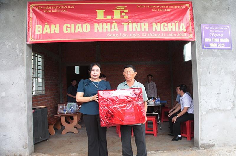 Trong không khí trang trọng và ấm áp, đồng chí Nguyễn Quốc Hân đã thay mặt VKSND tỉnh Đồng Nai trao tặng Nhà tình nghĩa cho gia đình. Bên cạnh đó, đại diện các đơn vị, doanh nghiệp cũng trao nhiều phần quà động viên, hỗ trợ thêm cho gia đình ông Ngân.