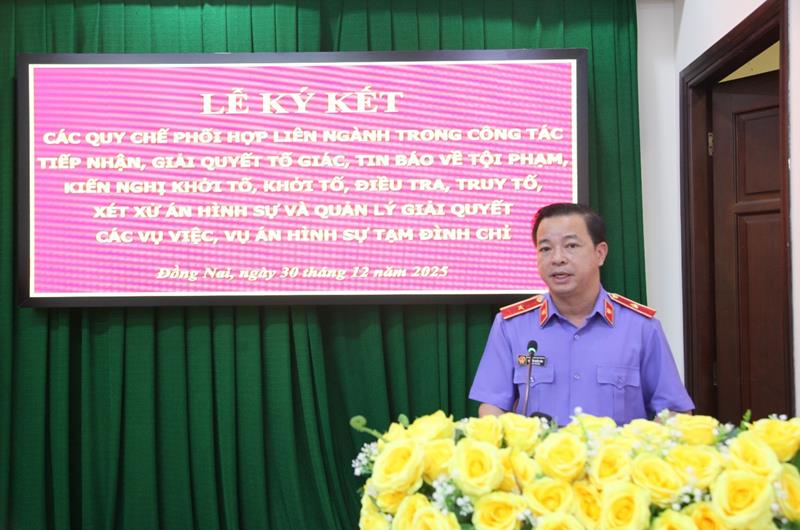 Phát biểu khai mạc buổi Lễ ký kết, đồng chí Nguyễn Quốc Hân, Viện trưởng Viện kiểm sát nhân dân tỉnh Đồng Nai nhấn mạnh tầm quan trọng của công tác phối hợp giữa liên ngành tố tụng và các cơ quan liên quan của tỉnh Đồng Nai, Bình Phước cũ và Đồng Nai mới sau sáp nhập đã tạo ra những đổi mới tích cực góp phần quan trọng vào việc giữ gìn an ninh, trật tự an toàn xã hội, đảm bảo xử lý đúng người, đúng tội, không bỏ lọt tội phạm, không làm oan sai người vô tội, bảo đảm quyền và lợi ích hợp pháp của con người.