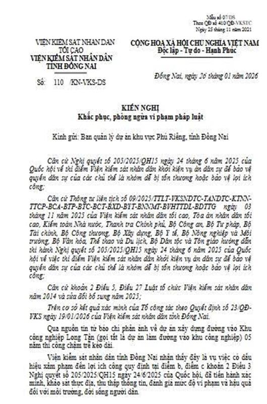 Kiến nghị khắc phục, phòng ngừa vi phạm pháp luật số 110/KB-VKS-DS ngày 26/01/2026 của Viện VKSND tỉnh Đồng Nai Kiến nghị khắc phục, phòng ngừa vi phạm pháp luật số 110/KB-VKS-DS ngày 26/01/2026 của Viện VKSND tỉnh Đồng Nai