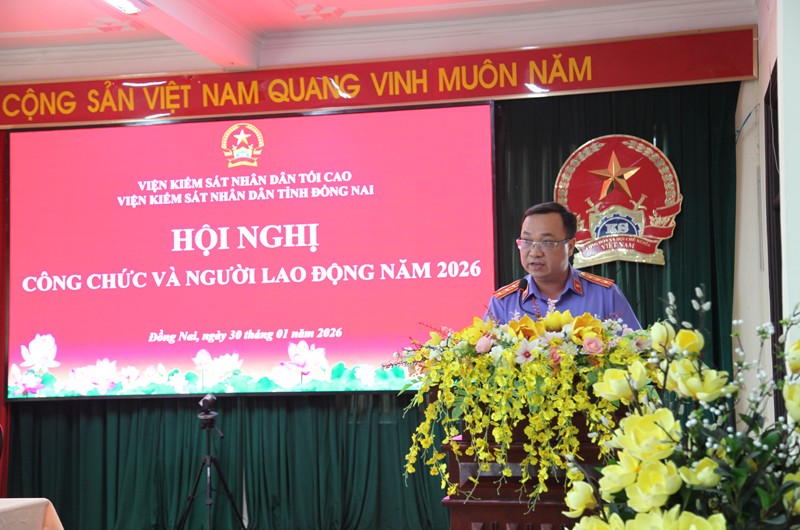 Chiều ngày 30/01/2026, Viện kiểm sát nhân dân (VKSND) tỉnh Đồng Nai đã tổ chức Hội nghị công chức và người lao động năm 2026 tại Hội trường VKSND tỉnh. Hội nghị là hoạt động thường niên có ý nghĩa quan trọng, nhằm phát huy quyền làm chủ của công chức, người lao động; đánh giá kết quả thực hiện nhiệm vụ công tác năm 2025; đồng thời thống nhất phương hướng, nhiệm vụ trọng tâm năm 2026.