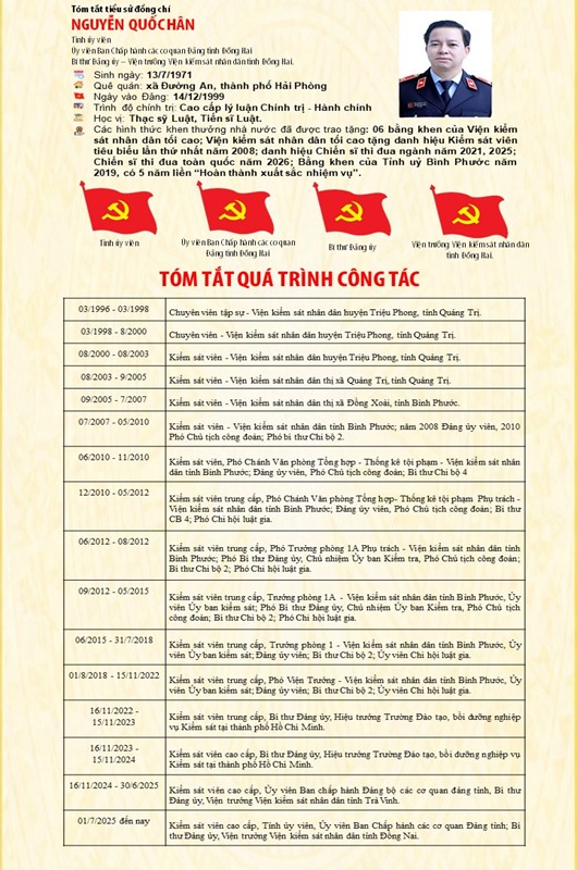 Ủy ban bầu cử tỉnh Đồng Nai đã công khai danh sách chính thức những người ứng cử đại biểu Hội đồng nhân dân tỉnh khóa XI, nhiệm kỳ 2026 -2031. Trong đó, đồng chí Nguyễn Quốc Hân, Viện trưởng VKSND tỉnh Đồng Nai tham gia ứng cử.