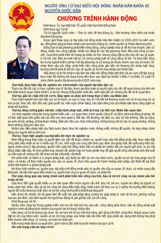 Chương trình hành động của đồng chí Nguyễn Quốc Hân, ứng cử viên Đại biểu HĐND tỉnh Đồng Nai khóa XI.