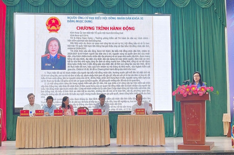 Trình bày chương trình hành động trước cử tri, đồng chí Đặng Ngọc Dung, Trưởng phòng Kiểm sát thi hành án dân sự, bày tỏ niềm vinh dự khi được giới thiệu ứng cử đại biểu HĐND tỉnh nhiệm kỳ 2026 - 2031. Đồng thời, trân trọng cảm ơn sự quan tâm, tạo điều kiện của Ủy ban bầu cử, cấp ủy, chính quyền, Ủy ban MTTQ Việt Nam các cấp, các sở, ban, ngành của tỉnh đã tạo điều kiện được gặp gỡ, tiếp xúc với cử tri.