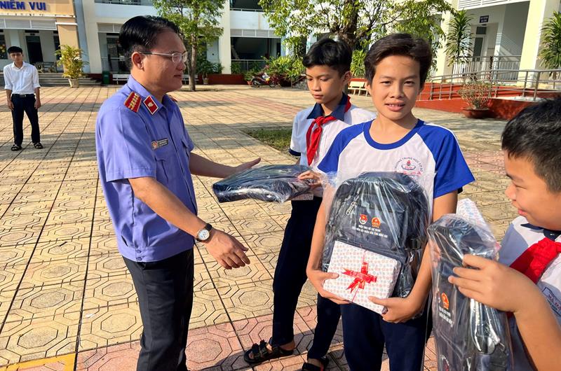 Đồng chí Ngô Văn Đạt, Ủy viên Ban Thường vụ Đảng ủy, Phó Viện trưởng VKSND tỉnh Đồng Nai tặng quà cho các em học sinh có hoàn cảnh khó khăn