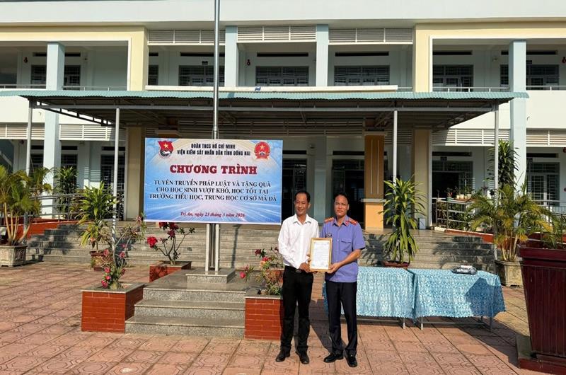 Ngày 23/3/2026, Chi đoàn VKSND tỉnh Đồng Nai tổ chức tuyên truyền pháp luật và tặng quà cho học sinh có hoàn cảnh khó khăn tại Trường Tiểu học, Trung học cơ ở Mã Đà, tỉnh Đồng Nai.