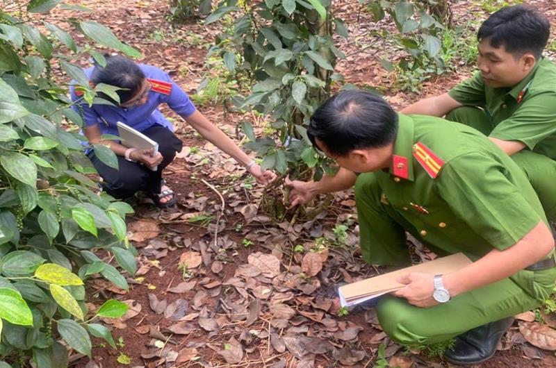 Tại hiện trường xác định, vườn hồ tiêu nhà ông Hoàng Tiến Hải nằm sâu trong khu vực không có dân cư sinh sống, là nơi nhân dân khu phố Bình Minh trồng trọt, khai thác cây công nghiệp lâu năm. Vườn hồ tiêu nhà ông Hải có diện tích khoảng 07 sào, các gốc hồ tiêu trồng trên thân cây điều và các cây thân gỗ khác có độ tuổi từ 10-15 năm tuổi, là nguồn thu nhập chính của gia đình ông Hải. Qua khám nghiệm ban đầu xác định có 87 gốc bị chặt ngang thân, nằm rải rác trong vườn, tập trung nhiều nhất vào các gốc hồ tiêu đang vào mùa thu hoạch có nhiều quả. Nhận thấy, hành vi chặt phá các gốc hồ tiêu là vi phạm pháp luật rất nghiêm trọng, thể hiện đối tượng thực hiện hành vi có ý thức xem thường pháp luật, xem thường giá trị sức lao động của người dân; gây phẫn nộ, bất bình và hoang mang trong tâm lý của những hộ nông dân trong vùng. Do đó, Kiểm sát viên đã yêu cầu cơ quan Công an tiếp nhận nguồn tin theo đúng quy định của pháp luật, bằng các biện pháp nghiệp vụ chuyên môn khoanh vùng, xác định đối tượng để nhanh chóng truy vết, đưa đối tượng đã thực hiện hành vi ra xử lý trước phạm luật.