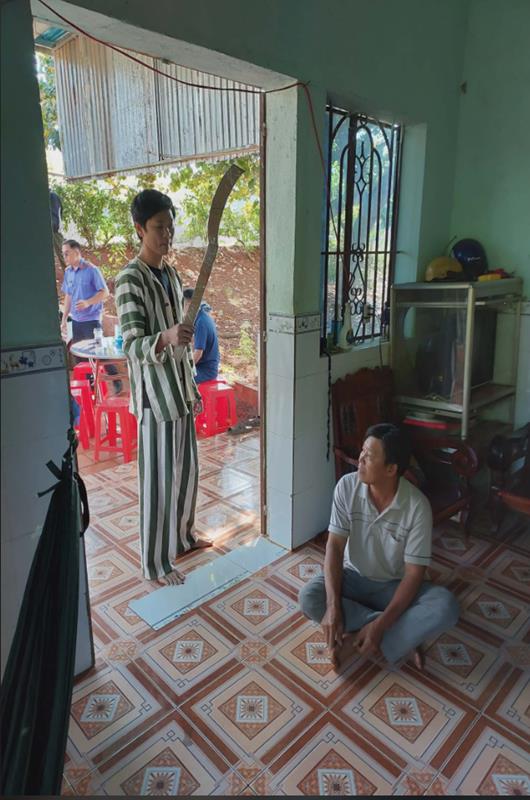 Theo nội dung thực nghiệm, khi xảy ra mâu thuẫn, đối tượng thấy bị hại trong tư thế ngồi dưới nền gạch phía trước hiên nhà đã cầm một vật có dạng dao rựa, vung từ trên xuống về phía bị hại đang ngồi trước hiên. Cú đánh được bị hại thấy và kịp thời tránh được nhưng vẫn trúng vào vùng đầu của bị hại, gây tổn thương. Khoảng cách giữa hai người được đo đạc cụ thể, góc độ vung hung khí và chiều cao bậc thềm cũng được ghi nhận nhằm làm rõ khả năng gây ra thương tích.