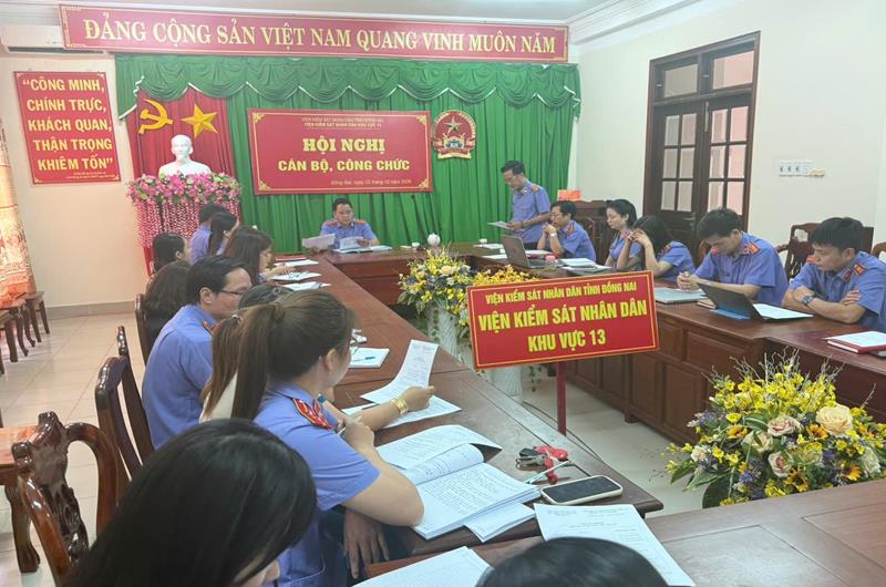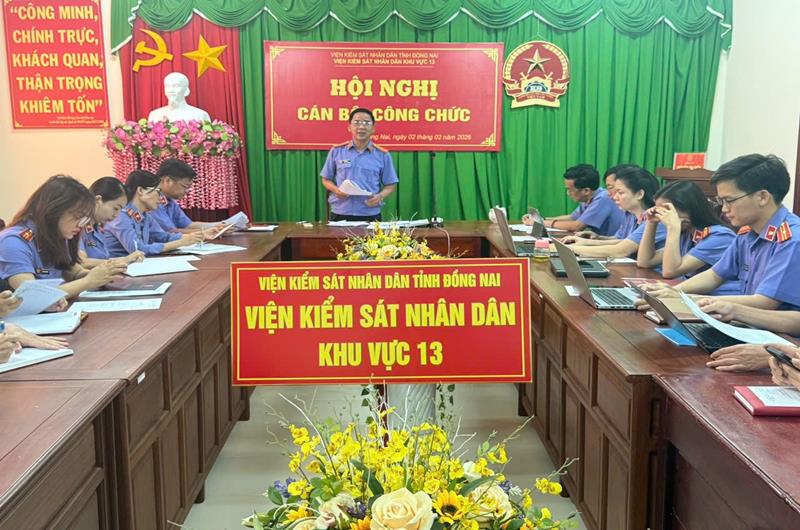 Căn cứ Luật Thực hiện dân chủ ở cơ sở và Quy chế thực hiện dân chủ trong hoạt động của Viện kiểm sát nhân dân (VKSND) Khu vực 13, tỉnh Đồng Nai. Chiều ngày 02/02/2026, VKSND Khu vực 13 tổ chức Hội nghị cán bộ, công chức, người lao động năm 2026; nhằm đánh giá kết quả thực hiện Nghị quyết Hội nghị cán bộ, công chức, người lao động năm 2025; phát huy quyền làm chủ của cán bộ, công chức, người lao động; bảo đảm việc thực hiện dân chủ, công khai, minh bạch trong mọi hoạt động của VKSND Khu vực 13;