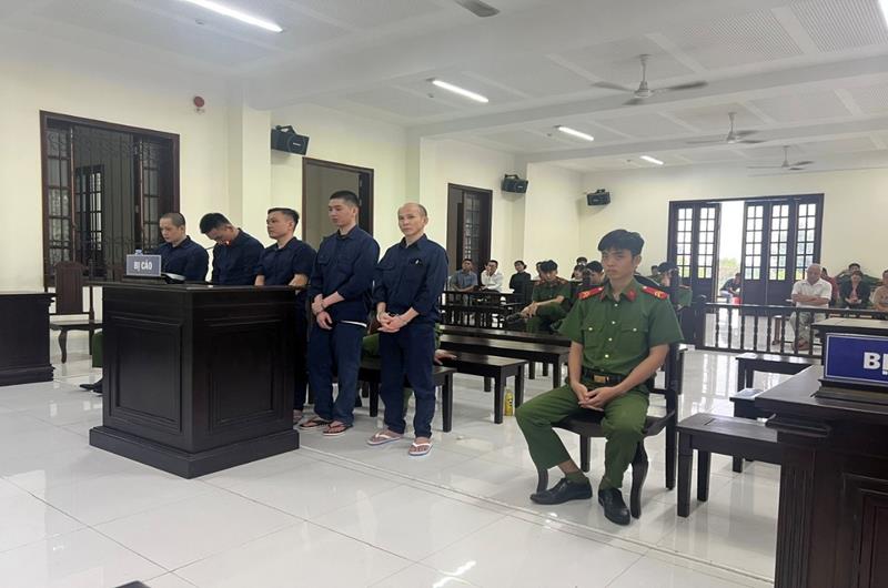 Các bị cáo Đồng, Long, Hiếu, Triều, Quế lần lượt từ trái qua phải Các bị cáo Đồng, Long, Hiếu, Triều, Quế lần lượt từ trái qua phải